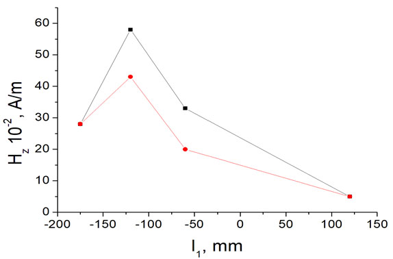 С целью оценки влияния ВЧ-электромагнитного поля на обработку различных материалов, в том числе металлических, измерялась напряженность магнитного поля. Результаты измерений представлены на рис. 4.