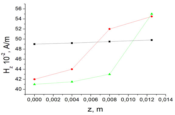 - аксиальная составляющая напряженности магнитного поля Hz у поверхности образца уменьшается на 30 − 50%, тогда как азимутальная составляющая Hφ возрастает на 20 − 30%;