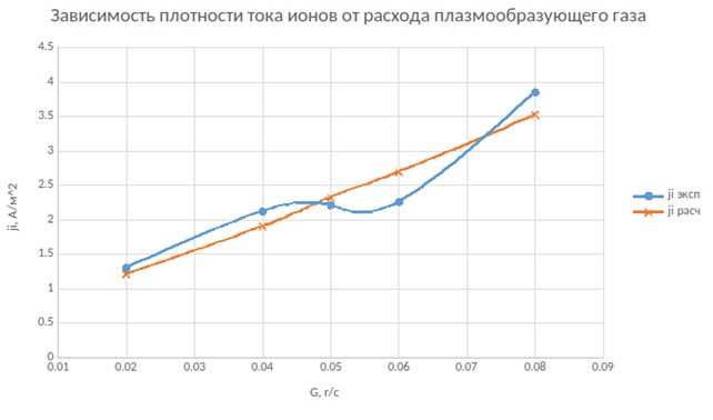 Рис. 5б. Зависимость плотности тока на поверхность от расхода плазмообразующего газа (p = 53,2 Па, 𝑃𝑝 = 1 кВт)