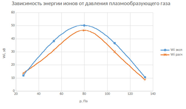Рис. 6б. Зависимость энергии ионов от давления плазмообразующего газа (Wp = 1 кВт, G = 0,04 г/с)