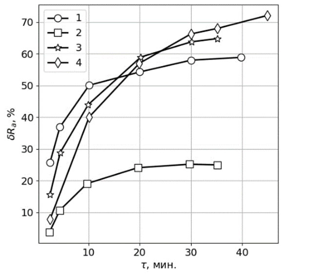 Рис. 7. Зависимость относительного уменьшения параметра шероховатости поверхности образца из ВТ9 от продолжительности обработки (р = 70 Па, Gг = 0,08 г/с). ВЧИ разряд, Рp = 2,1 кВт, z = 65 мм, f = 1,76 МГц: 1 – аргон, 2 – аргон с 5% азота, 3 – неон, 4 – гелий.