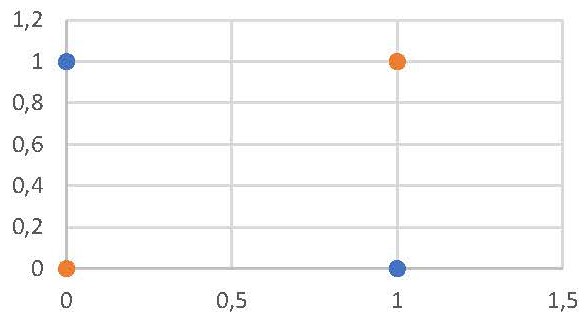 Введение. Проблема XOR (exclusive OR, исключающее ИЛИ) – одна из наиболее важных классических проблем в области машинного обучения (МО). Поэтому ее решению различными способами посвящено большое количество исследований. Впервые эту проблему сформулировал создатель персептрона Фрэнк Розенблатт в 1961 году [1]. Наиболее просто данная проблема воспринимается, когда она сформулирована в геометрическом виде (рисунок 1). Пусть имеется всего 4 точки: две синих и две красных. Необходимо отделить синие точки от красных одной прямой.