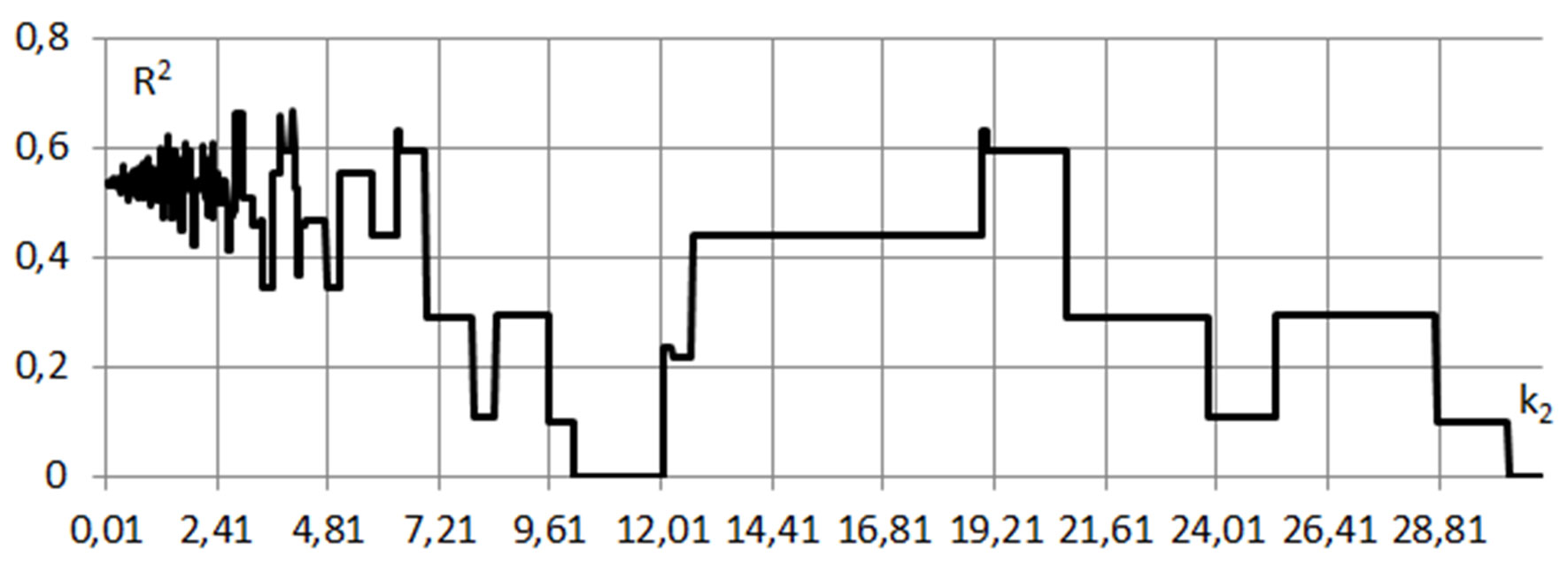 Рис. 3. Зависимость R2 от k2