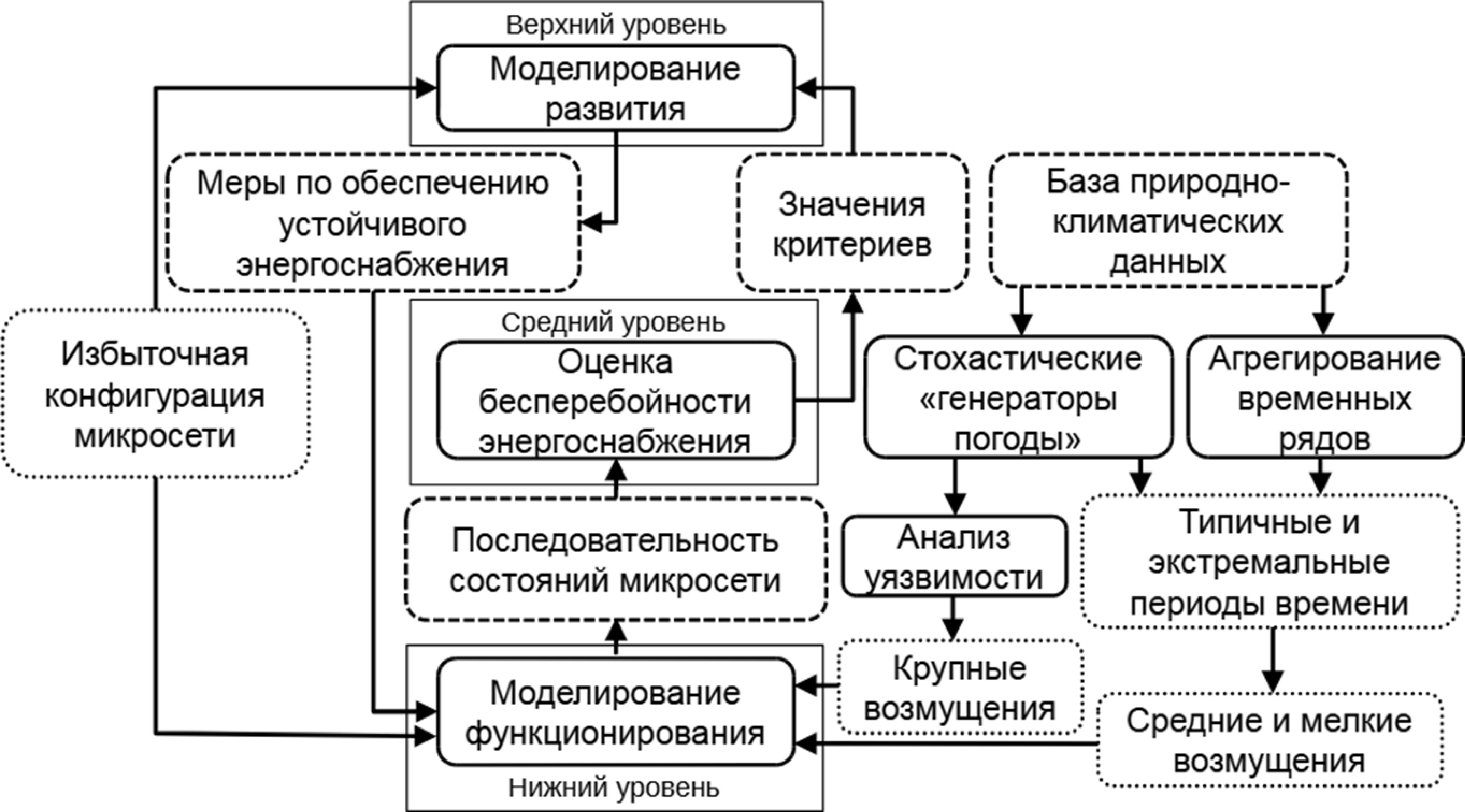 В данной работе предпринята попытка разработки такого комплексного подхода на основе существующей схемы исследования живучести ЭК. Представленная многоуровневая схема структурно-параметрической оптимизации позволяет лицам, принимающим решения, за приемлемое время получить целый спектр альтернативных перспективных конфигураций микросети, обеспечивающих устойчивое и бесперебойное энергоснабжение потребителей в заданных неблагоприятных условиях. Эти конфигурации могут быть далее проанализированы с учетом дополнительных неформализованных знаний о конкретной системе. Стохастические «генераторы погоды» в данной схеме необходимы для формирования временных рядов природно-климатических данных разной длительности, близких к реальным в заданном географическом положении, при проверке эффективности промежуточных и окончательных результатов расчёта.