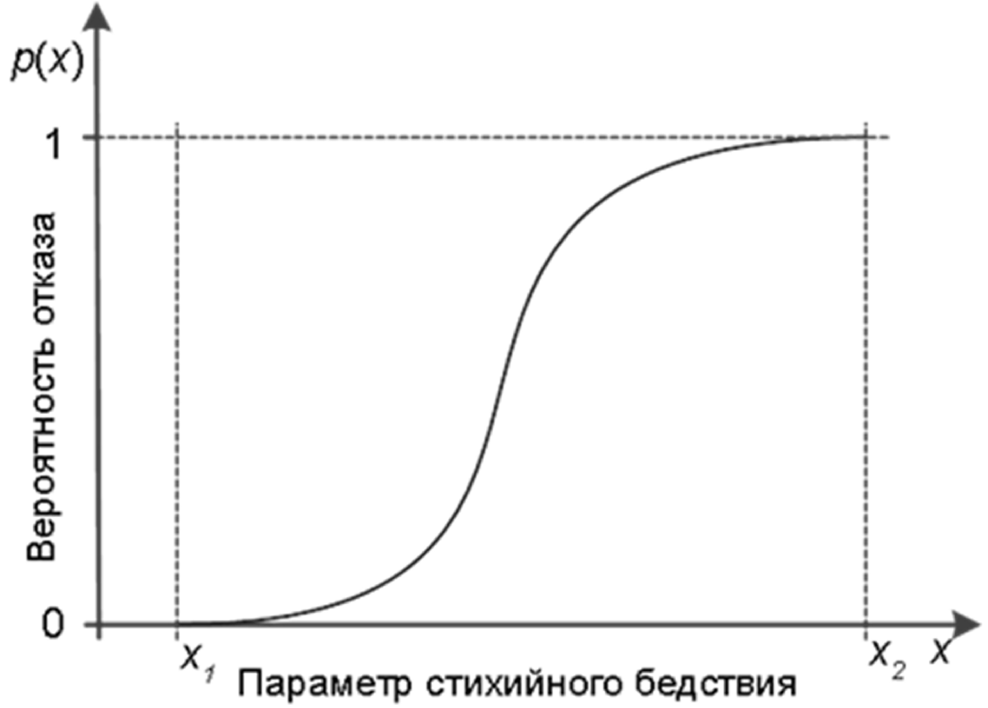 Типовой график уязвимости компонента показан на рис. 5, где обозначает параметр стихийного бедствия, – вероятность отказа компонента, – интенсивность стихийного бедствия, начиная с которой вероятность отказа компонента начинает возрастать, представляет собой значение параметра стихийного бедствия, при котором однозначно происходит отказ компонента, т.е. [26].