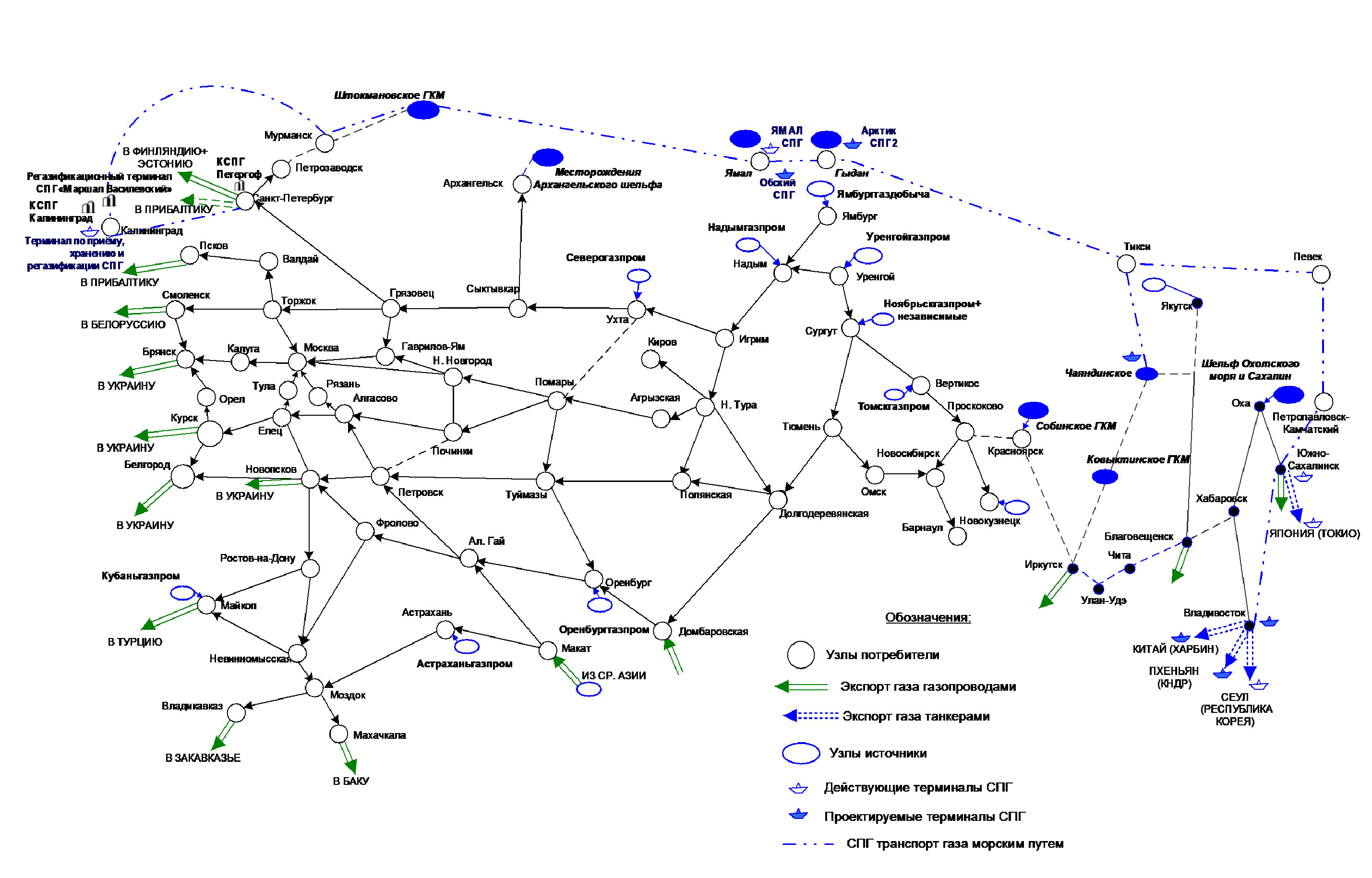 - С помощью предложенного алгоритма для преобразования реальной схемы ГСС в более простую создана расчетная схема ЕСГ с детализацией северных и восточных регионов РФ. На схему добавлен морской транспорт СПГ.