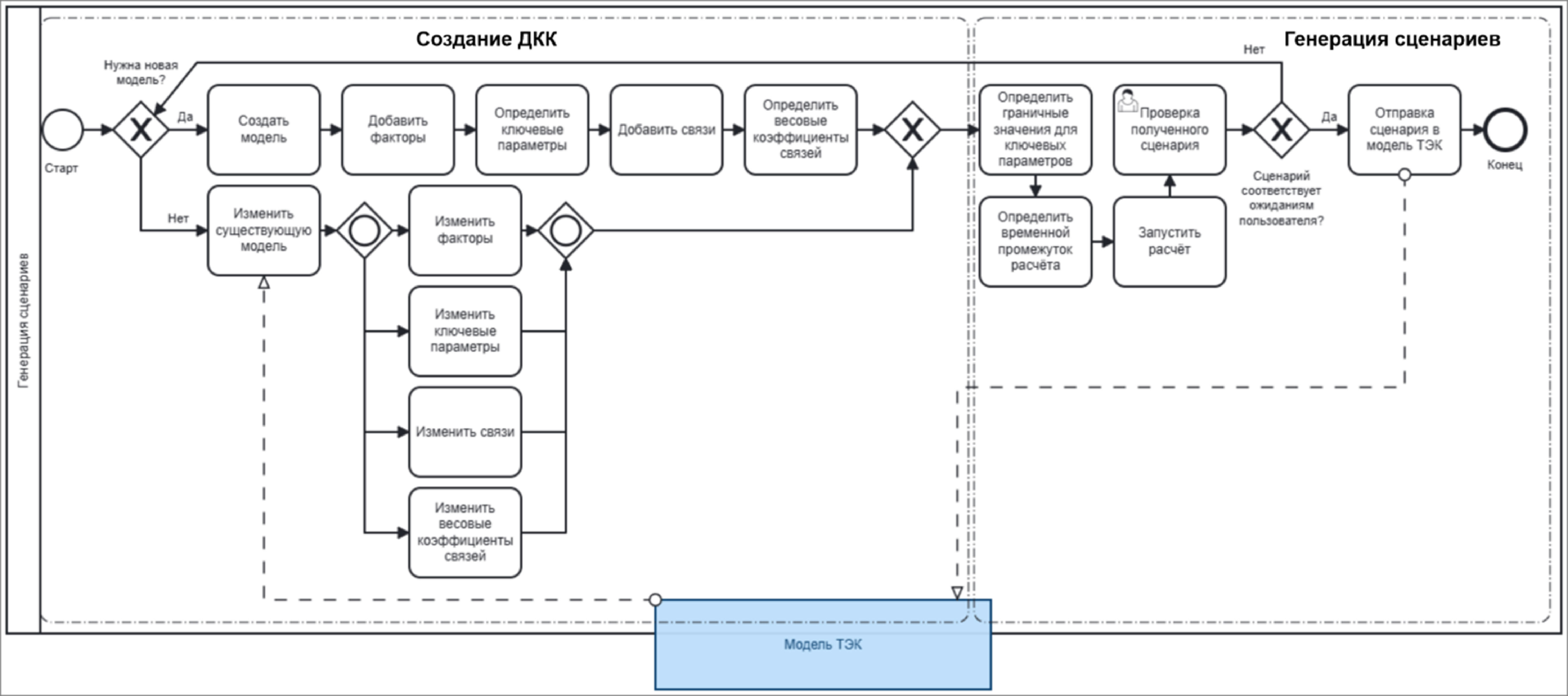 3.7.1. Общее описание задачи. Описываемая задача предназначена для генерации сценариев на основе построенной пользователем ДКК. В ходе проведения эксперимента ключевые параметры изменяются в соответствии с ранее описанными правилами при составлении ДКК. Эксперимент ограничен по времени, которое задается пользователем. По завершению эксперимента генерируется сценарий, который может быть интегрирован в оптимизационную модель ТЭК, изменен или сохранен.
