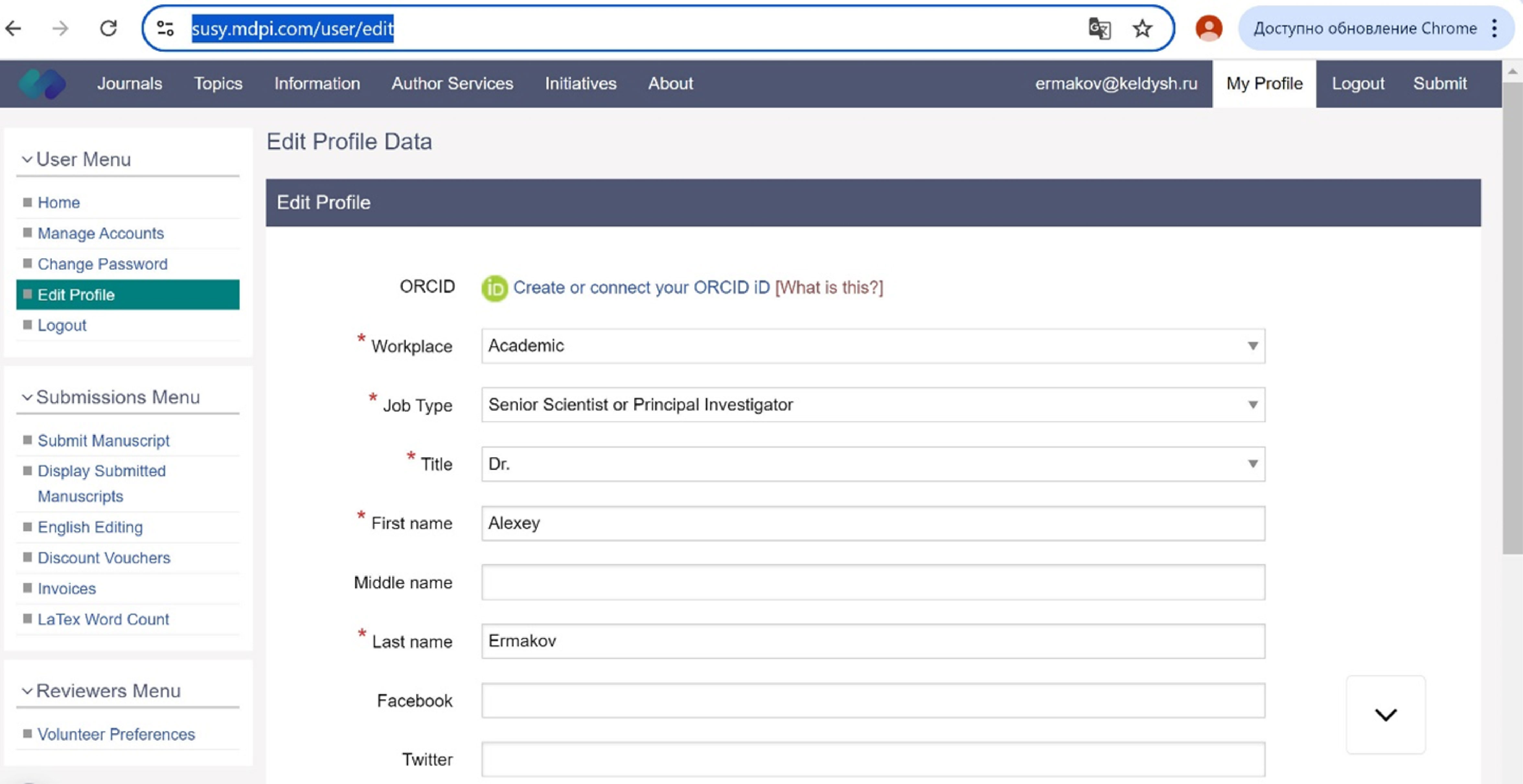 - Registratsionnaya forma avtora v izdatel'stve MDPI [Registration form of the author in the publishing house MDPI]. Available at: https://susy.mdpi.com/user/edit.