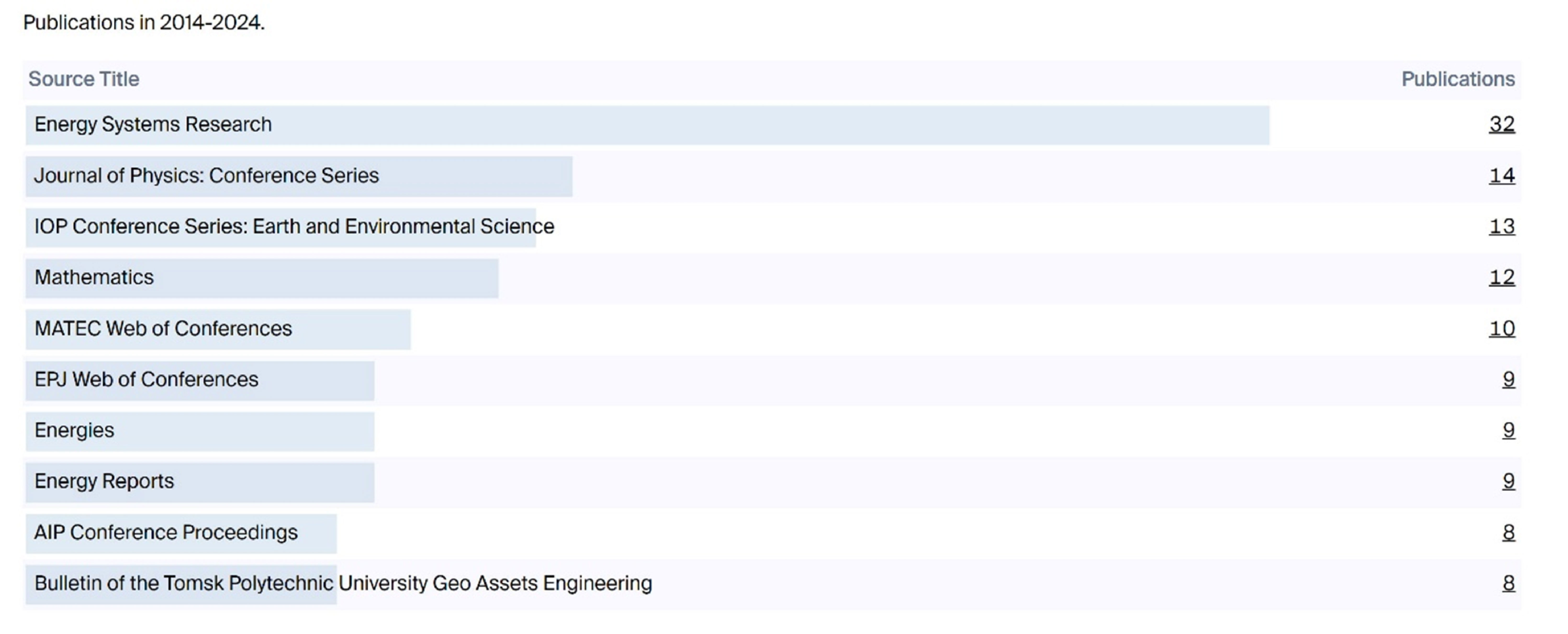 На рис. 5 показаны «источники» метаинформации – издания, в которых публиковались статьи сотрудников ИСЭМ и которые стали источником метаданных научных публикаций для приведенной статистики.