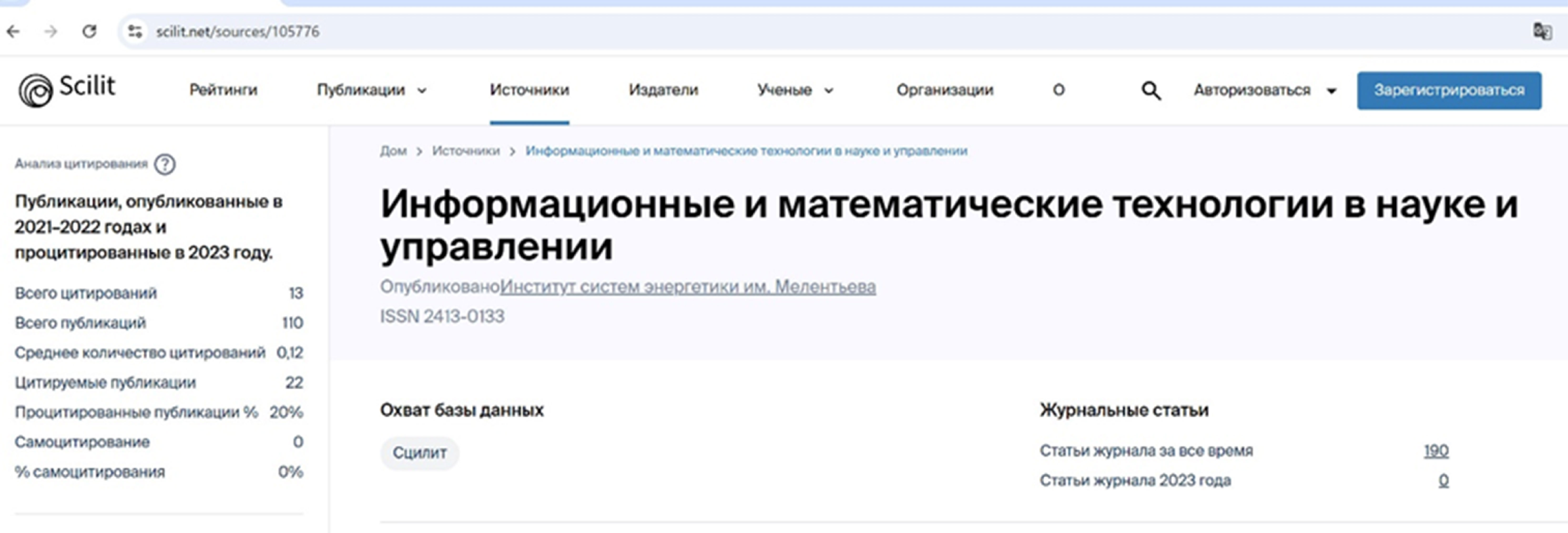 Это абсолютно нелогично для размещения метаданных в англоязычной базе Crossref, но, тем не менее, информационно-аналитическая система Scilit видит этот журнал, и, задав название в поле ввода на главной странице системы, получим достаточно полный аналитический обзор о нем (рис.14).