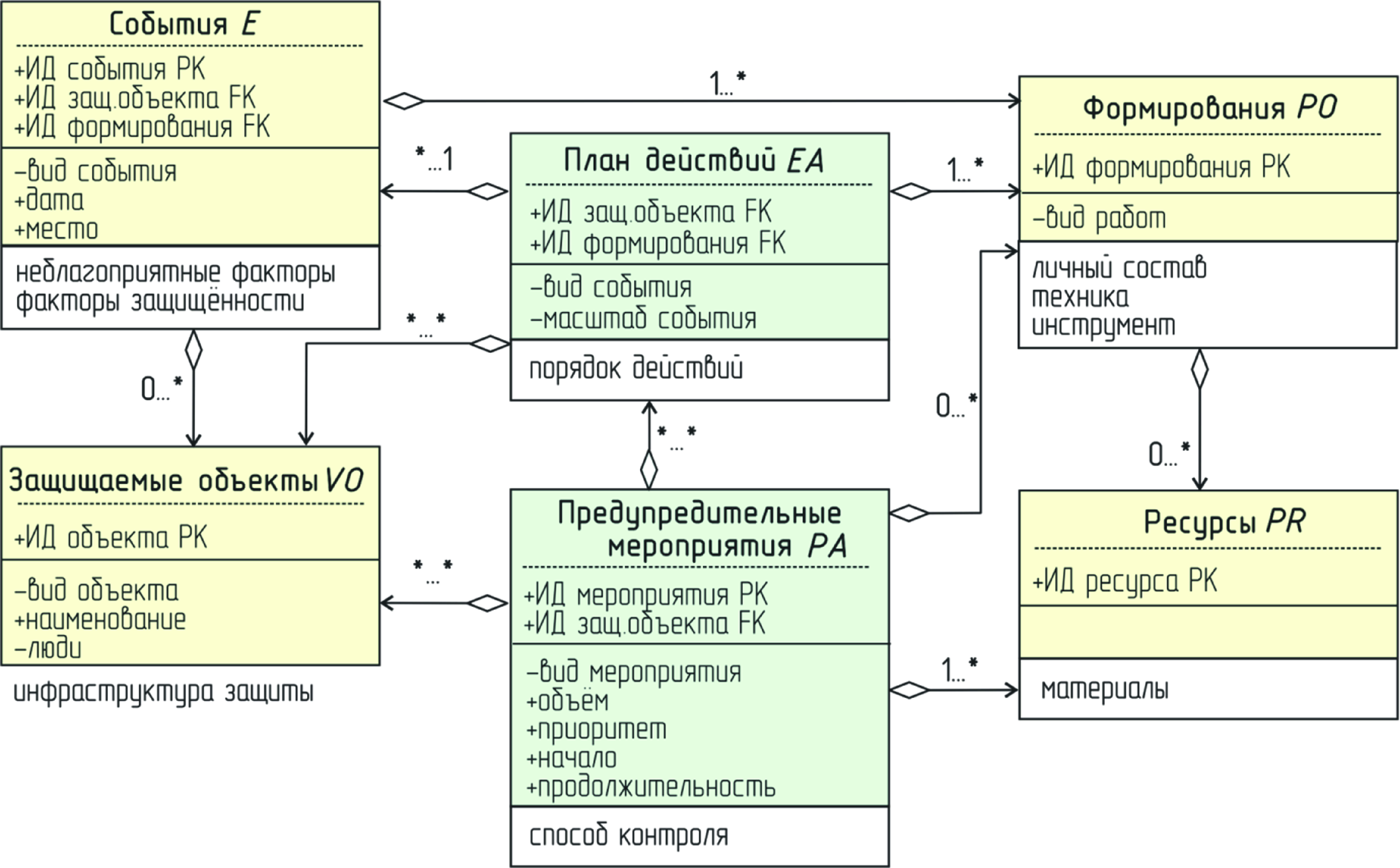 Общие части реестров объектов и событий показаны жёлтым фоном; белым – характеристики, изменяющиеся в зависимости от видов ситуаций и масштаба защищаемых объектов (здание, поселение, территория). Зелёный фон показывает сущности, на основе которых формируются управленческие решения. Пространственная привязка позволяет оперативно визуализировать результаты ситуационного и аналитического моделирования. Логическую целостность данных обеспечивают связи через первичные (PK) и вторичные (FK) ключи. Знаком «+» отмечены показатели, на основе которых строятся аналитические модели. Содержание справочников (знак «–»), таких, как «Вид события», «Категория объекта», «Вид мероприятия» определено нормативно [15].