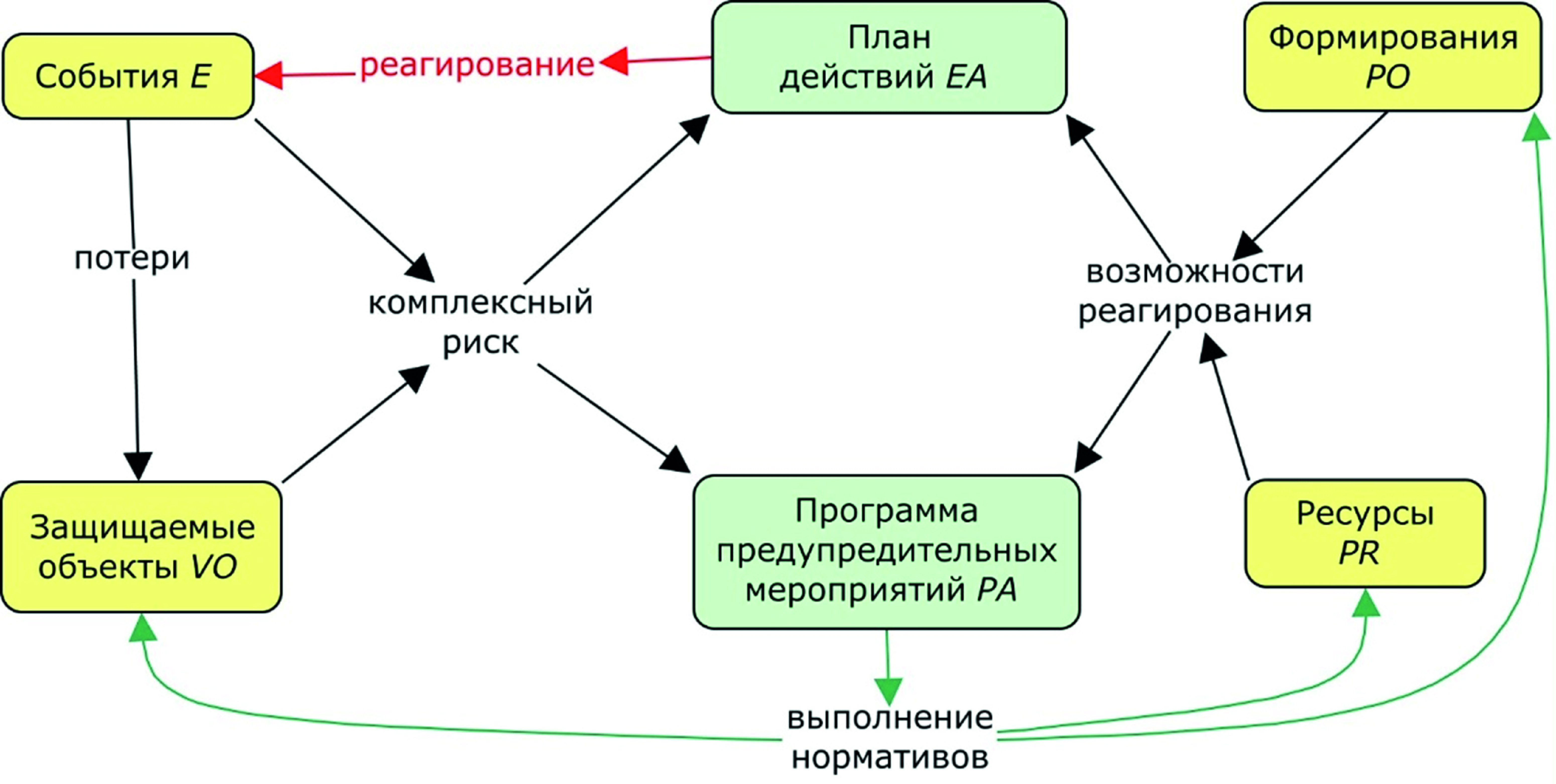 Атрибуты событий E позволяют проводить оценку и картографирование рисков традиционными методами [16]. В число неблагоприятных факторов включаются неуправляемые (сложные погодные условия), а также факторы, для устранения которых необходимо проведение предупредительных мероприятий PA: например, к условиям, осложняющим тушение пожаров, относят удалённость пожарных частей, водоисточников, загромождение проездов, наличие взрывоопасных и легко воспламеняющихся материалов/веществ, степень осведомлённости людей о мерах пожарной безопасности и навыках поведения в ЧС.