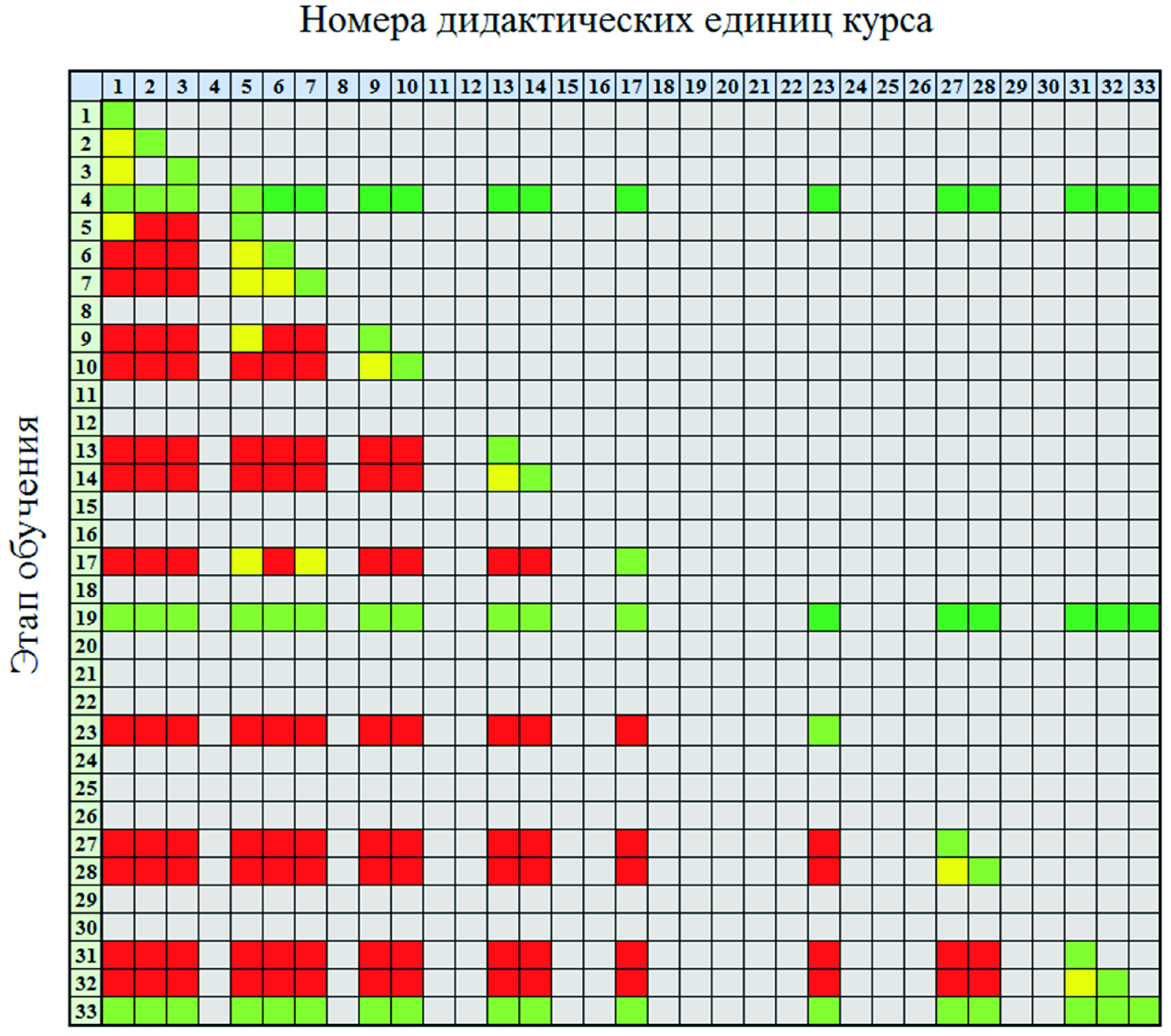 Динамика показателей. Данные, которые будут учитываться при отрисовке ККДЗ для дисциплины из примера, приведены на схеме (рис. 4). По оси абсцисс (горизонтали) показан номер дидактической единицы, а по оси ординат (вертикали) – шаг обучения относительно базовой траектории обучения (исключая повторное обращение к учебному материалу): очевидно, что на этапе входного и итогового контроля в проверке участвовал материал всего курса, в середине семестра аналогичный срез делался в качестве фиксации промежуточных результатов изучения дисциплины. Цвета обозначают три режима актуализации (охвата контролируемого материала):