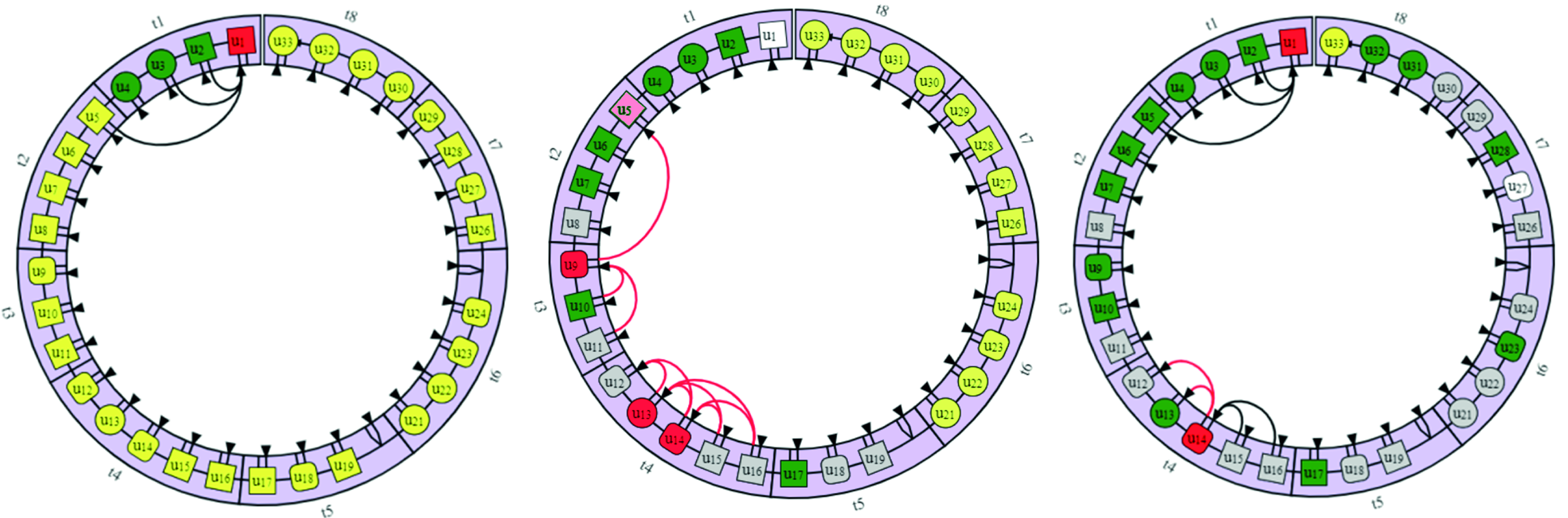 Метод когнитивных карт диагностики знаний. ККДЗ – это метод составления когнитивных карт (картирования), осуществляющий компактное представление (визуализацию) семиотических структур (данных о синтактике, семантике и прагматике) в приложении к диагностике знаний об экземпляре какого-либо объекта или выполняемого им процесса (денотат) с целью повышения качества процесса принятия решений и их аргументированности [6]. Примеры карт в различных режимах приведены далее на рис. 2-4 и 6. Каждый элемент карты (квадрат ui) соответствует дидактической единице, а его раскраска – оценке степени её освоения в знаниевом или одном из компетентностных аспектов (в зависимости от выбранного): зелёный – полностью освоен, красный – совсем не освоен, белый – граница неопределённости, серый – не укомплектован измерительными материалами. За счёт того, что в этой графической нотации совмещены синтактическая (структурная) составляющая (дидактический материал ui расположен по кругу в соответствии с исходной образовательной траекторией) и семантическая (соответствующие причинно-следственные связи внутри круга), такое представление позволяет сформировать целостный образ сложившейся учебной ситуации. Рассмотрим пример на базе одной из учебных дисциплин «Методология научной деятельности», состоящей из 33-х дидактических единиц. Базовая карта этого курса ориентирована на отражение структуры учебного материала (левая часть с рис. 2), а частная карта адаптируется под индивидуальный образовательный запрос конкретного учащегося (см. правую часть). Для дополнения этой конструкции элементами прагматики (для довершения построения сущности по квадрату Поспелова из подхода прикладной семиотики [10]) используется другая нотация – сквозная карта, о которой можно подробнее прочитать в [11] (далее для иллюстрации данной статьи нам эти нотации ККДЗ не понадобятся).