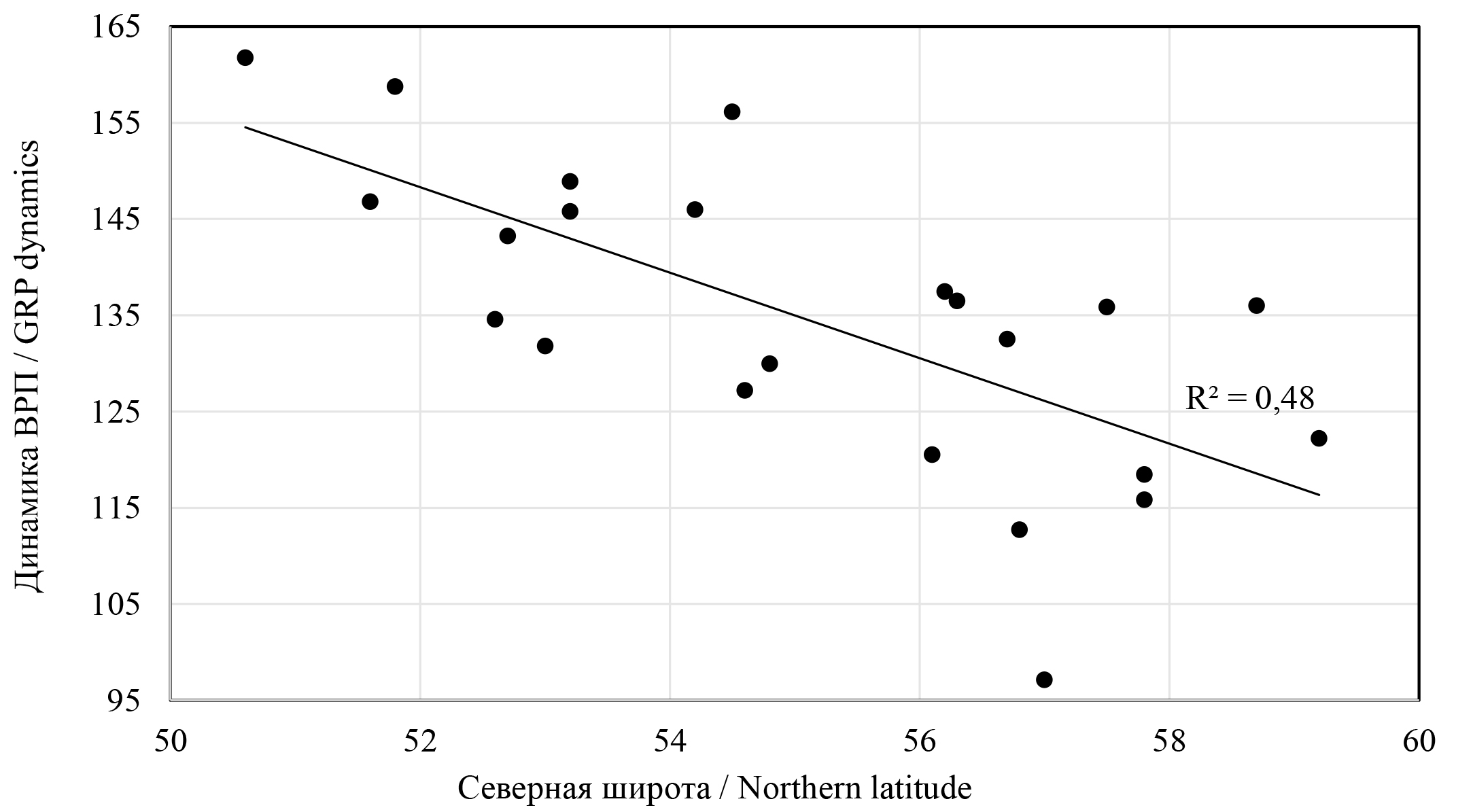 Fig. 2. Dynamics of GRP growth in 25 central regions of the European part of the Russian Federation (excluding Moscow and the Moscow region) for 2009‒2021 depending on the northern latitude of the regional capital, 2009 ‒ 100 %