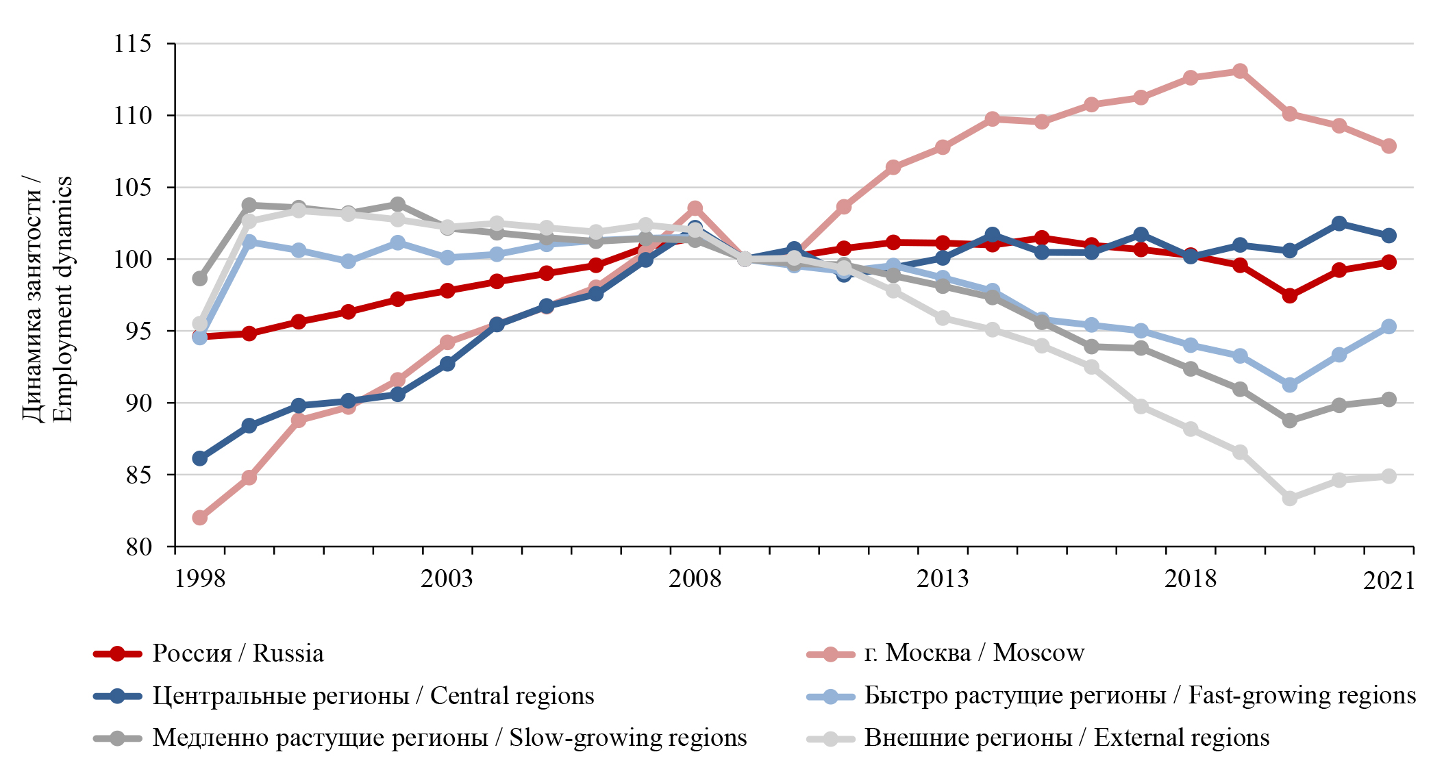 Рис. 3. Динамика занятости населения в пяти группах регионов центра европейской части России в 1998‒2021 гг., 2009 г. ‒ 100 %