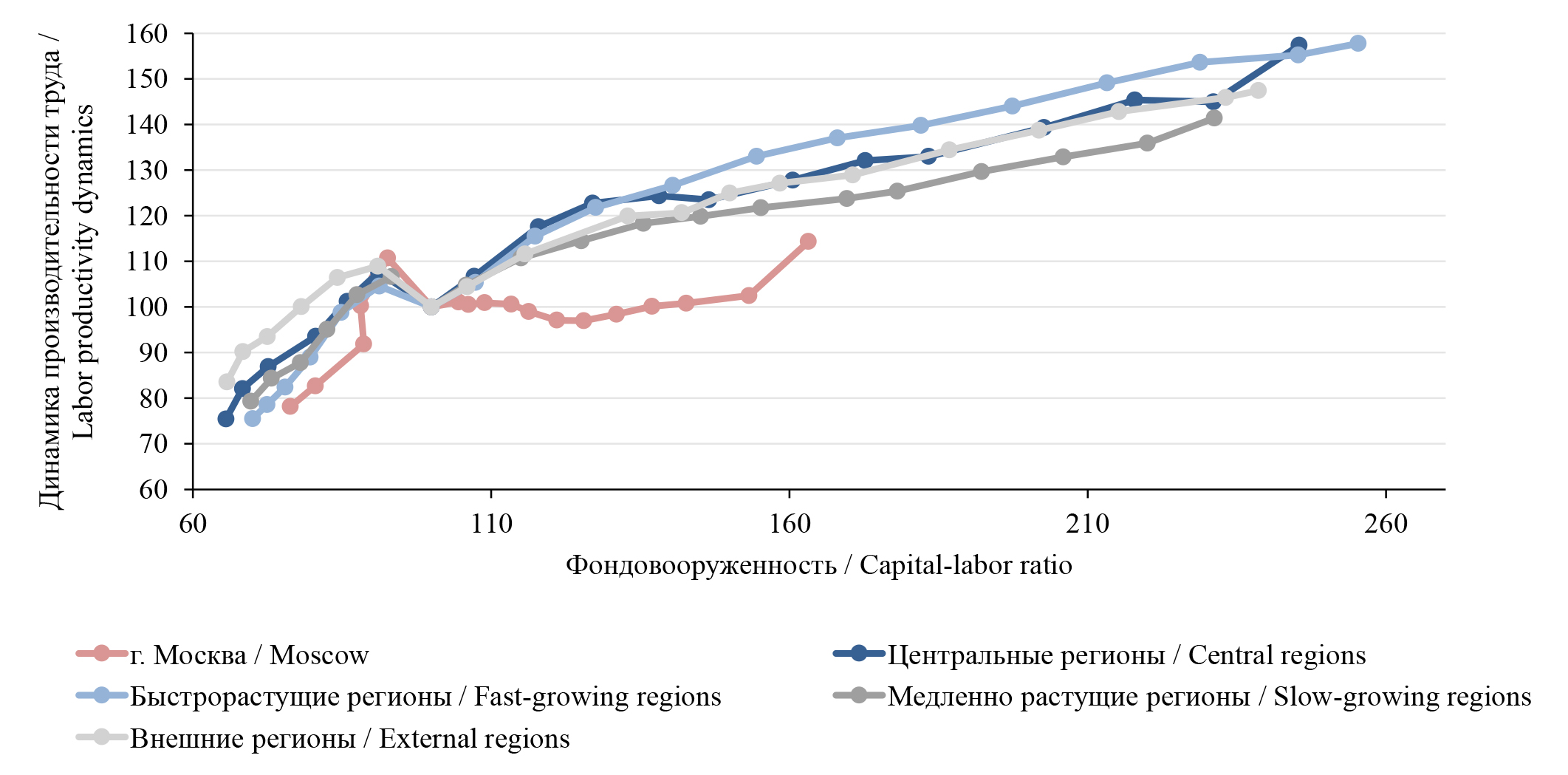 Fig. 5. Dependence of labor productivity on capital-labor ratio in five groups of regions in the center of the European part of the Russian Federation in 2003‒2021, 2009 ‒ 100 %