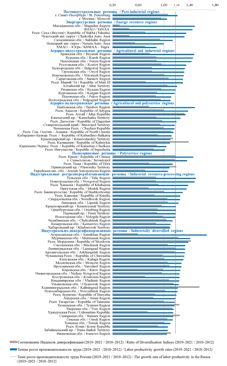Выявленное в ряде российских регионов сочетание относительно высоких темпов роста производительности труда и роста уровня диверсификации экономики указывает на опережающее развитие в них высокопроизводительных отраслей специализации с высоким мультипликативным эффектом, предполагающим параллельный рост в регионе вспомогательных и обслуживающих видов деятельности.