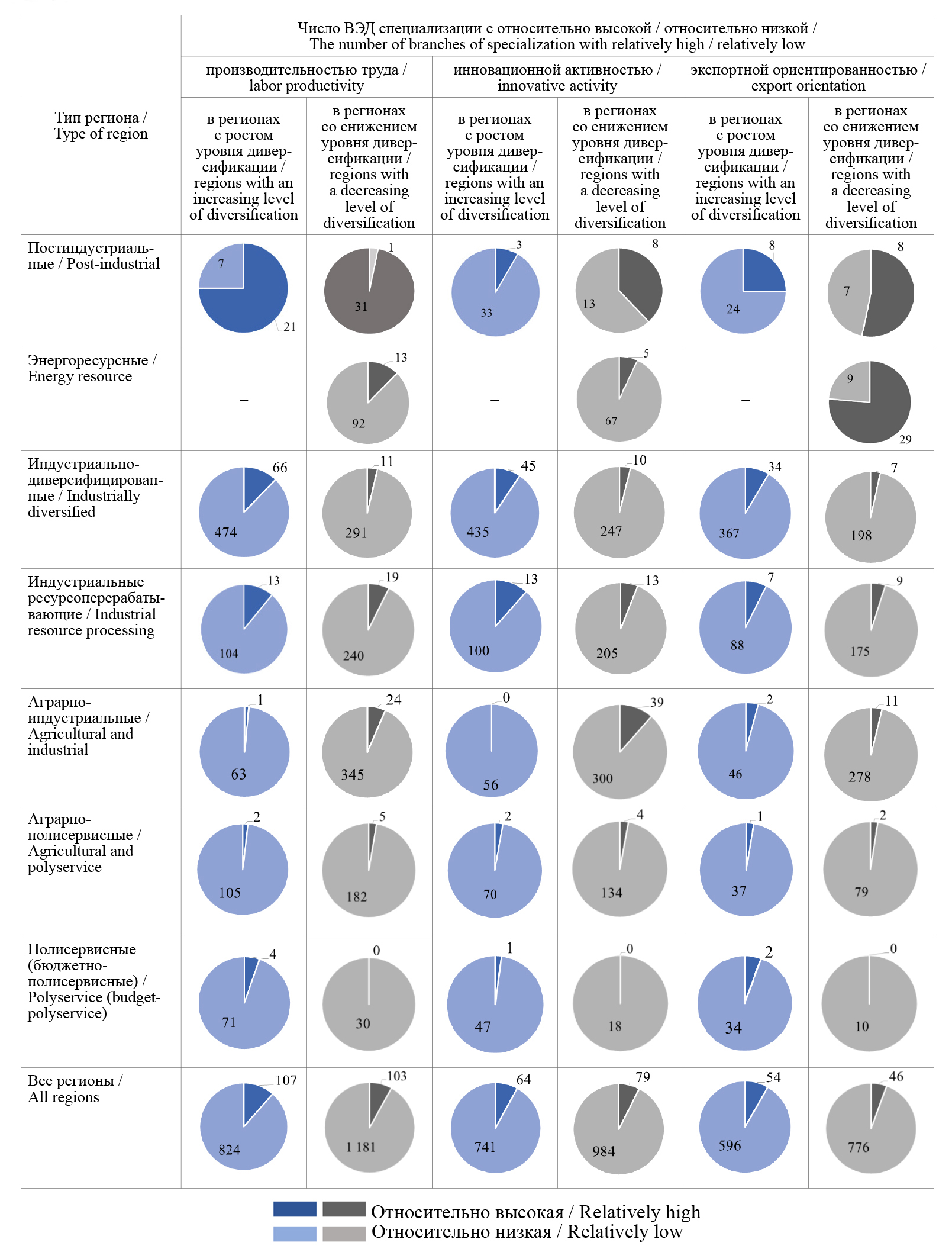 Анализ распределения высокоэффективных (высокопроизводительных) региональных специализаций по совокупности регионов соответственно с ростом и со снижением уровней диверсификации экономики в разрезе выделенных типологических групп показывает, что при наличии примерного равенства обеих групп специализирующих отраслей по России в целом (соответственно 107 и 103 ВЭД) значительное (шестикратное) превышение числа данных отраслей в регионах с ростом диверсификации характерно только для индустриально-диверсифицированной их группы (66 и 11 соответственно). Напротив, на фоне усиления роли существующих региональных специализаций и параллельного снижения уровня диверсификации отраслевых структур, локализация отраслей специализации с высокой производительностью труда, а также с высокой инновационной активностью и экспортной ориентированностью особенно явно выражена в энергоресурсных (соответственно 13, 5 и 29 ВЭД) и аграрно-индустриальных (24, 39 и 11 ВЭД) регионах России.