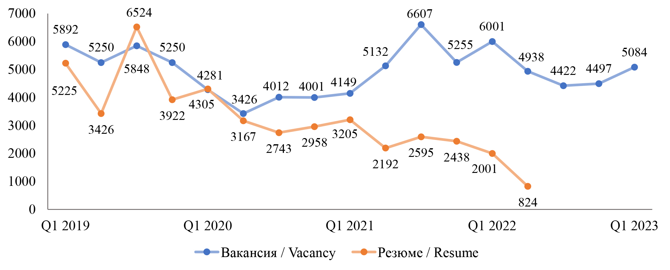 Рис. 6. Динамика упоминаний должностных обязанностей «работа с клиентами» и «работа с документацией» в вакансиях и резюме, 2019–2023 гг.