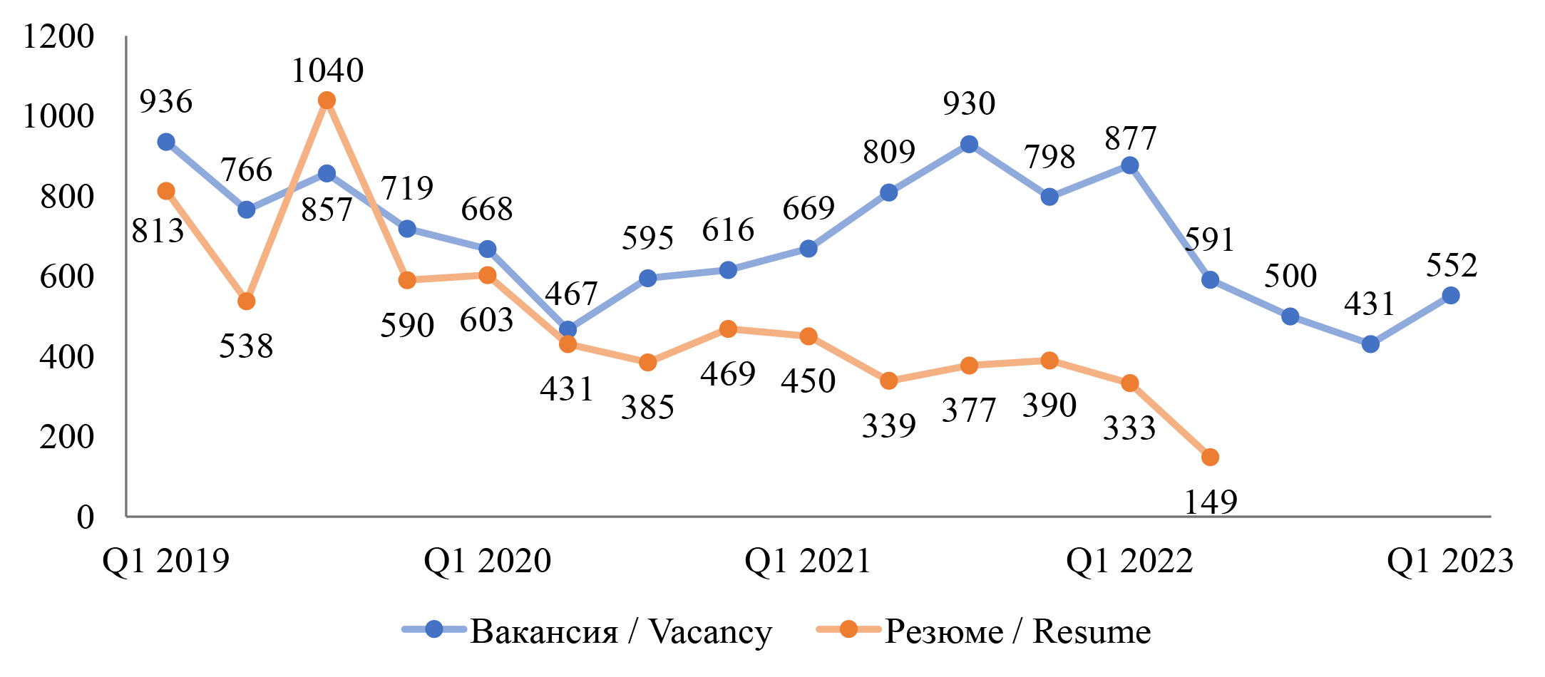 Рис. 8. Динамика упоминаний должностных обязанностей «мягкие навыки» и «уровень образования» в вакансиях и резюме, 2019–2023 гг.