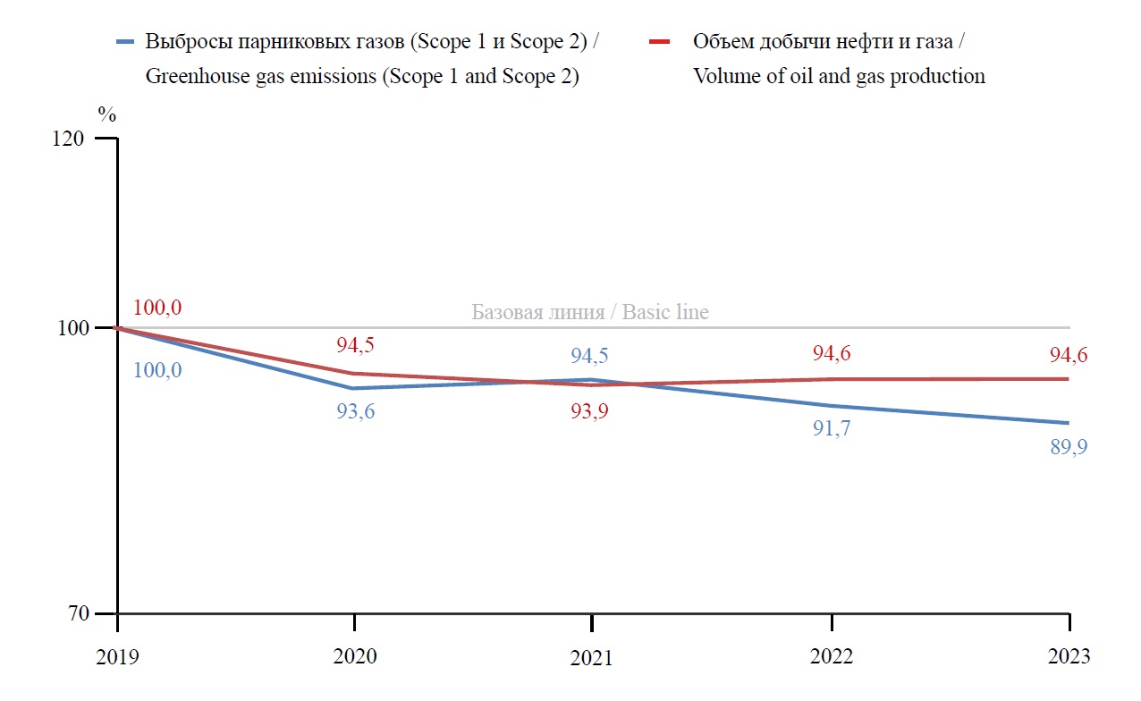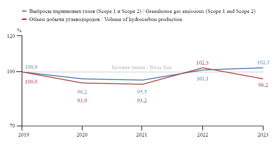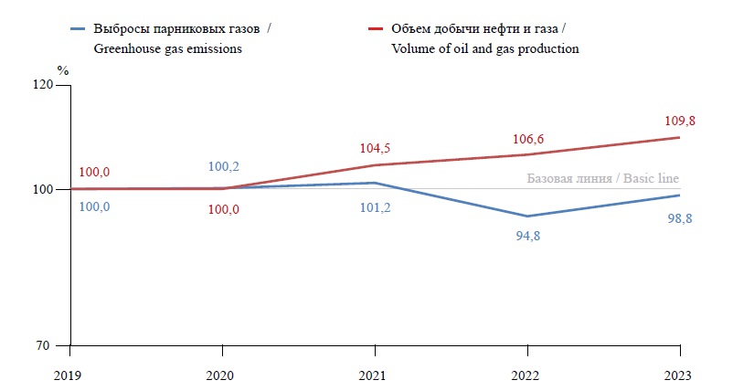 В 2019–2021 годах объемы выбросов парниковых газов Scope 1 и Scope 2 предприятием сократились на 4,5 %, хотя и добыча углеводородов снизилась на 6,8 %. Однако в 2022 году, несмотря на увеличение добычи углеводородов на 10,5 %, выбросы парниковых газов выросли всего на 5,9 %, что стало возможным благодаря уменьшению интенсивности сжигания газа на 16,5 % за счет улучшения внутренних систем утилизации. В 2023 году на фоне понижения добычи углеводородов на 6,6 % произошел рост выбросов парниковых газов на 1,1 % (рис. 1), что обусловлено включением в одноименный кадастр нефтеперерабатывающего завода Jazan производительностью 400 тыс. барр./сут.