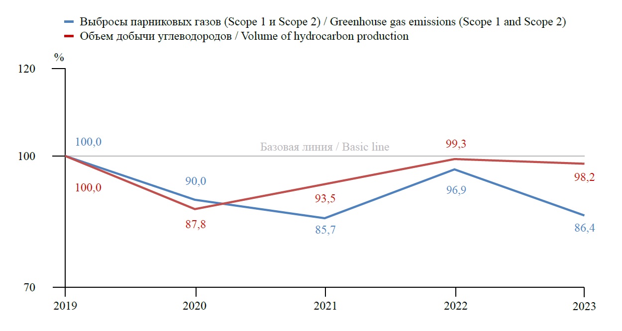 Компания стремится к 2050 году достичь нулевых выбросов парниковых газов Scope 1 и Scope 26; к 2035 – улавливать и хранить до 11 млн т CO2 в год, а также сократить углеродоемкость на 15 % по сравнению с базовым показателем 2018 г. в 9,1 кг CO2 e/бнэ; к 2030 г. – инвестировать в проекты по солнечной фотоэлектрической и ветровой энергии общей мощностью до 12 ГВт.