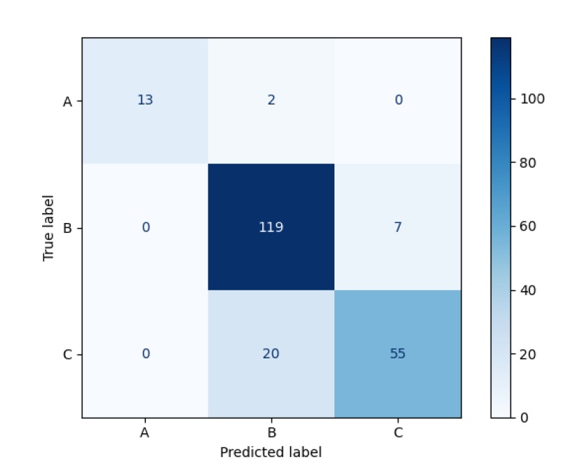 Этап 3. Матрица ошибок, представленная на рисунке 1, показывает, что модель, обученная для интегрального показателя I-score, на тесте неправильно определила лишь 13,3 % регионов класса ‘A’ (2 : (13 + 2) 100 %), 5,6 % – класса ‘B’ (7 : (119 + 7) 100 %) и 26,7 % регионов класса ‘C’ (20 : (55 + 20) 100 %). При этом F1-score (мера производительности модели, которая объединяет точность и полноту в единую метрику в диапазоне от 0 до 1, т. е. служит гармоническим средним точности и полноты) равен 0,83. Это достаточно качественный результат.