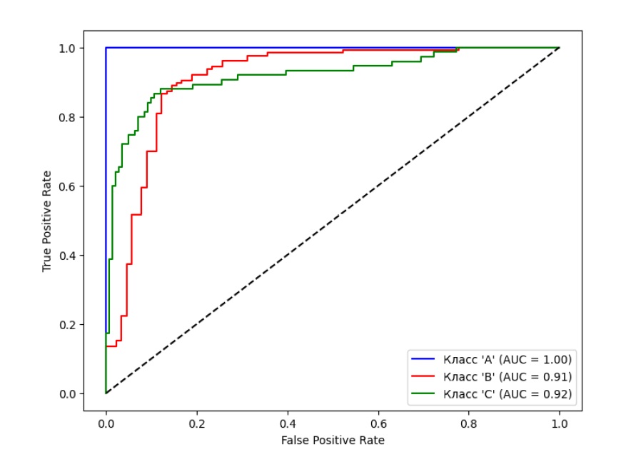 Графики ROC/AUC продемонстрировали достаточно качественные результаты на тесте для всех трех рейтингов (рис. 2). Средний ROC/AUC составил 0,94.
