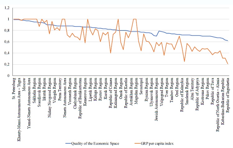 В ходе регрессионного анализа установлена высокая теснота связи интегрального уровня качества экономического пространства российских регионов как с индексом подушевого ВРП, так и с его абсолютным значением.