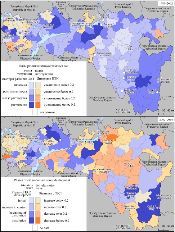 Снижение доли титульного этноса в Чувашии вело к росту величины индекса этнической контактности. Динамика названных двух показателей свидетельствует о нахождении республики в состоянии второй фазы развития ЭКЗ (роста контактности) на волне детитулизации населения. Республика Татарстан до 2010 г. переходила к третьей фазе развития ЭКЗ (началу растворения) на волне титулизации населения, которая во втором десятилетии XXI в. вышла на аналогичные с Чувашией этнические процессы. Еще более сложной динамикой отличается Республика Башкортостан, которая в 90-е гг. ХХ в. и во втором десятилетии XXI в. испытывала рост контактности на волне титулизации населения, но между этими интервалами (в первом десятилетии XXI в.) пережила кратковременный период с противоположной динамикой.