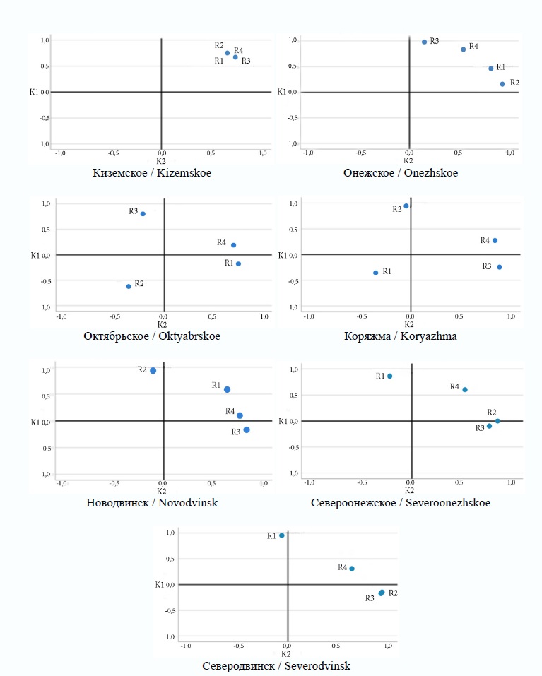 Fig. 5. Attractors of socio-economic development of single-industry towns in the Arkhangelsk region in the factor space