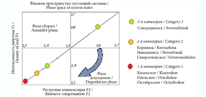 Очевидно, что из трех стадий развития фаза истощения экологического ресурса, приводящая к стагнации социально-экономической системы моногорода, является наиболее неблагоприятным состоянием, ранжируемым по 1-й категории.