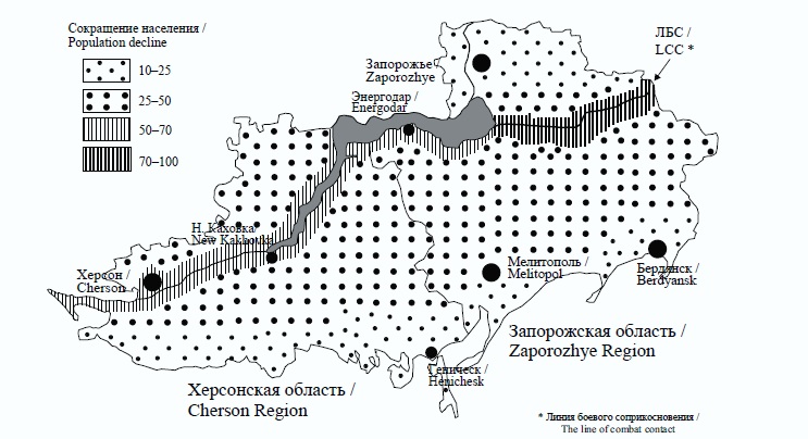 Results. It was found that during the spring and summer of 2022, there was a significant decrease in the available population of both areas as a result of outmigration. Moreover, the losses of the urban population were higher than those of the rural population. The maximum population losses were suffered by the Dnieper cities and the settlement network of the frontline zone of the Zaporozhye Region. In both areas, the age structure of the population has significantly deformed (a significant increase in the proportion of elderly and old people), the shortage of specialists in the main areas of socio-economic activity has sharply worsened. It is recorded that in 2022–2023 the only major sphere of economic life that continued to function on a scale comparable to peacetime was agricultural production and related segments of industry (primarily food).