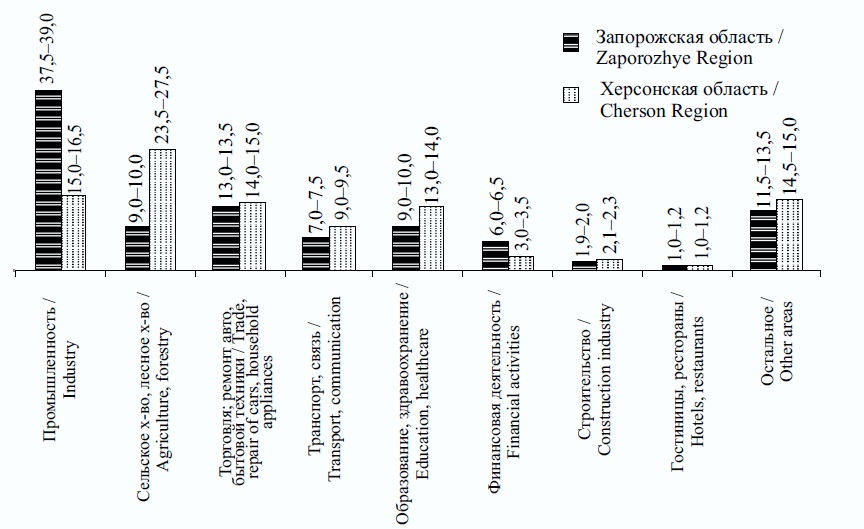 Экономика: структура, базовые специализации, потенциал развития. Структура экономики Херсонской и Запорожской областей существенно различалась и в период СССР, и в постсоветские десятилетия. В центре хозяйственной системы Запорожской области сохранялся индустриальный комплекс, на который в 2010-е гг. приходилось 37–39 % валовой добавленной стоимости (в том числе 26–27 % на обрабатывающую промышленность). Экономика Херсонской области строилась с упором на сельское хозяйство. Деиндустриализация 1990-х гг. аграрную специализацию региона еще более усилила. В отличие от Запорожья, большинство крупных предприятий Херсонщины в начале XXI в. не возобновило деятельность, а в 2010-е гг. на сельскохозяйственное производство в области приходилось около четверти ВРП (на промышленность только 14,5–16,0 %) (рис. 2). Однако вооруженный конфликт и сумма трансформационных процессов 2022–2023 гг. существенным образом отразились на структуре экономики обеих областей и динамике ее крупных сегментов.
