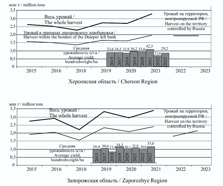 В 2010‒2020 гг. в Херсонской области собирали 2,27–2,74 млн т зерна (3,2‒4,5 % урожая Украины). Зерноводческий комплекс (пшеница, рожь, овес, ячмень, просо) представлял одну из устойчивых хозяйственных ниш региона, но максимальный вклад фиксировался в сегменте овощеводства. В 2015‒2021 г. в области собирали 1,25–1,32 млн т овощей (13,6–14,0 % урожая Украины). В 2022-2023 гг. урожай зерновых в области составлял по 1,5 млн т (рис. 3). Хотя без правобережья Днепра площадь пахотных земель сократилась с 1,78 млн га до 1,1 млн30. Потери овощеводческого кластера были куда весомей – урожай упал с 860–870 тыс. до 80 тыс. т.