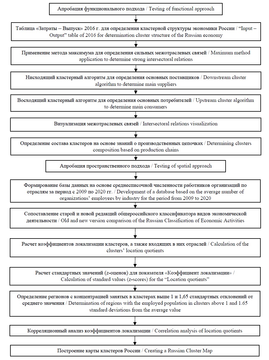 На рисунке 1 представлен авторский алгоритм идентификации кластеров, сочетающий функциональный подход на основе анализа таблицы «Затраты – Выпуск» за 2016 г. и пространственный подход на основе экономики локализации.