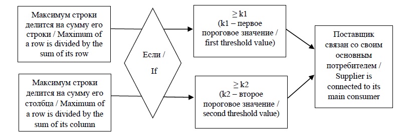 Существуют два кластерных алгоритма: алгоритм для нисходящего анализа (downstream) и для восходящего анализа (upstream). Ниcходящая часть связана с поиском кластерных связей на основе промежуточных поставок, осуществляемых поставщиком пользователю, в то время как восходящий анализ посвящен поставкам, осуществляемым пользователю поставщиком. Нисходящая кластерная связь устанавливается, когда поставка сделана конкретным поставщиком своему основному потребителю, представляет собой относительную величину, превышающую установленное пороговое значение. Восходящая кластерная связь устанавливается, когда поставка осуществляется конкретному потребителю от своего основного поставщика, представляет относительную величину, превышающую установленное пороговое значение12.