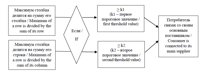 Выбор пороговых значений k1 и k2 является отдельной исследовательской задачей. Первое пороговое значение необходимо для исключения связей между отраслевыми группами, где относительная важность поставки относительно велика только для одной из двух отраслей, но относительно мала для другой. Второе пороговое значение существенно ниже первого, так как только первое используется для проверки максимумов.