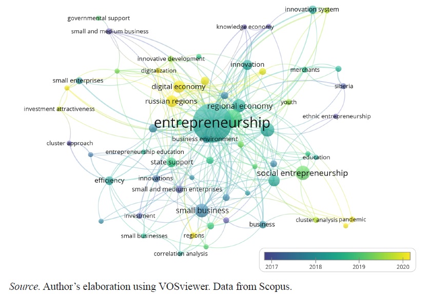 Figure 2 shows that the leading thematic clusters include the entrepreneurship, small business, social entrepreneurship, digital economy, innovation, state support, and efficiency, among others.