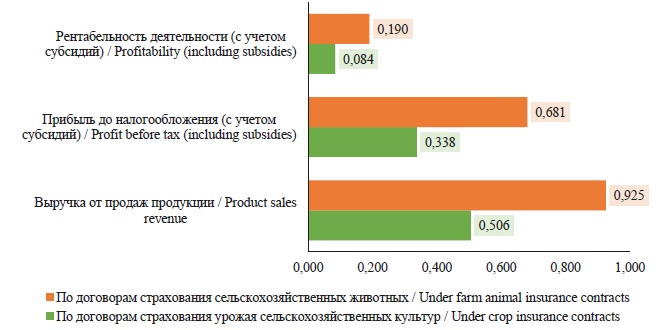 Важным аспектом исследования эффективности государственной поддержки страхования в сельском хозяйстве является оценка его влияния на финансовые результаты и рентабельность сельскохозяйственных товаропроизводителей. Прежде всего необходимо принимать во внимание, что сельскохозяйственное страхование может оказывать воздействие лишь на отдельные сегменты финансовой и хозяйственной деятельности хозяйствующего субъекта. В частности, расходы на оплату страховых взносов по договорам страхования учитываются в составе прочих расходов, а объем полученного страхового возмещения – в составе прочих доходов. Следовательно, страхование не оказывает прямого воздействия на величину выручки от реализации, но влияет на размер прибыли до налогообложения. То же самое касается и показателей рентабельности, рассчитанных на основании данных статей финансовых результатов.