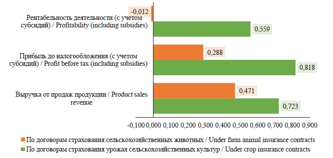 Проведенный анализ свидетельствует о высокой связи между страховыми выплатами и финансовыми результатами деятельности производителей в отрасли растениеводства. В отрасли животноводства данное воздействие выражено в гораздо меньшей степени. При этом выявлена высокая зависимость между уровнем страховой защиты (страховой суммой) и финансовыми результатами производителей в отрасли животноводства и крайне низкая связь в отрасли растениеводства. Сельскохозяйственное страхование с государственной поддержкой в контексте охвата страховым покрытием (величины страховой суммы) оказывает значительное влияние на уровень финансовой устойчивости производителей отрасли растениеводства и животноводства. В то же время связь между финансовой устойчивостью производителей сельскохозяйственной продукции и полученным страховым возмещением можно охарактеризовать как умеренную.