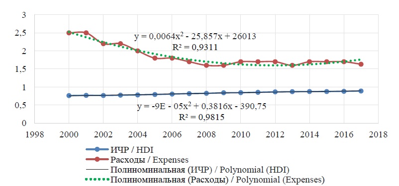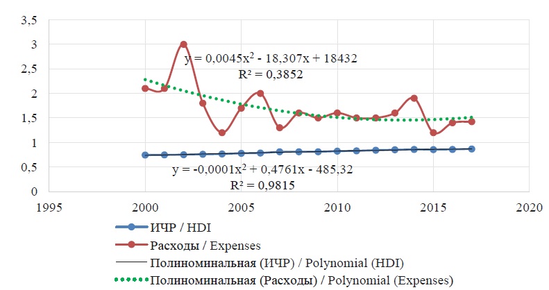Результаты статистического анализа взаимосвязи доли расходов на алкогольные напитки в расходах на конечное потребление домашних хозяйств, а также ИЧР в регионах России за 2000–2017 гг. изложены в приложении 13. Коэффициенты детерминации рассчитаны с использованием построенных трендовых моделей ИЧР и расходов для России в целом и всех субъектов. Примеры графических моделей для типичных регионов Российской Федерации показаны на рисунках 1–4.