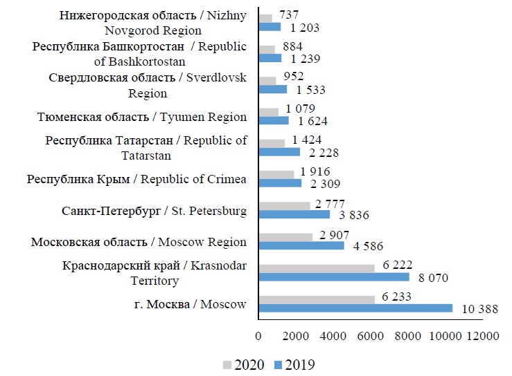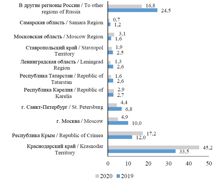 Интересен анализ спроса россиян на отдых внутри России в разрезе территорий до пандемии и в постпандемийный период. Как в 2019 г., так и в 2020 г. турфирмами больше всего туристов было направлено в Краснодарский край и Республику Крым – центры пляжного отдыха страны (рис. 2).