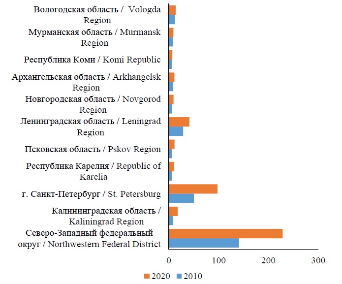 Высокая динамика показателя отмечена в Калининградской (рост в 3,1 раза) и Ленинградской областях (рост в 1,7 раза), Республике Карелия (рост в 1,3 раза) и г. Санкт-Петербурге (рост в 1,3 раза) за счет высокой транспортной доступности и развитой туристической инфраструктуры в этих субъектах.
