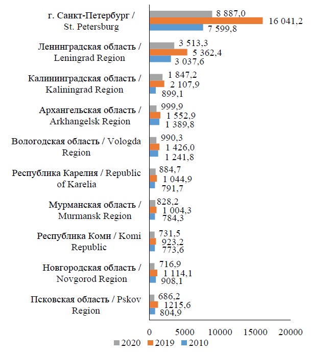 В допандемийный период первое место в округе по динамике увеличения спроса на средства размещения принадлежит Калининградской области (в 3,9 раза), что можно объяснить ростом интереса в связи с проведенным мундиалем, а также активной пиар-кампанией Ростуризмом туристических возможностей региона. В Вологодской области число туристов, воспользовавшихся за 2010–2019 гг. услугами средств размещения, росло не так быстро: показатель увеличился в 1,4 раза, что ниже, чем в СЗФО в целом (рост в 2 раза). Это свидетельствует о необходимости более активного развития туризма в регионе в условиях роста конкуренции за туристов со стороны соседних регионов.