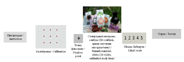 Сувенирная продукция была представлена на 26 слайдах, демонстрируемых на мониторе компьютера рандомизированно. Порядок проведения эксперимента показан на рисунке 1.