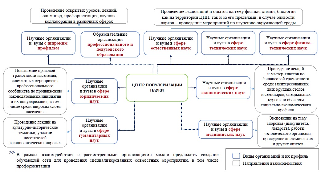 Развитие современной системы популяризации науки в России на базе ЦПН и научных кварталов. С точки зрения понятий и организационной структуры границы между ЦПН и научно-техническими музеями размыты, поэтому предлагаются следующие определения: музей – это место хранения культурных и научных ценностей определенного времени; центр популяризации науки – это обособленная территория, которая включает научные лаборатории, образовательные центры, экспозиции современного искусства в области науки и техники, ориентированные на распространение научных знаний в современной и доступной форме для широкого круга посетителей, которым предоставляется возможность непосредственного участия в проведении научных исследований, в том числе виртуальных24.