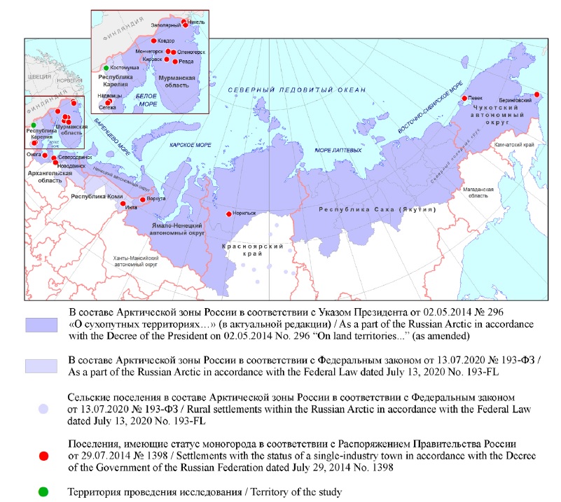 Пространственные и экономические особенности территории проведения исследования. Городской округ Костомукша территориально расположен на Северо-Западе Российской Федерации, на территории субрегиона карельской Арктики, сформировавшегося в результате вхождения ряда северных муниципалитетов Республики Карелия в состав сухопутных территорий АЗРФ4, в непосредственной близости к границе с Финляндией. Общими для рассматриваемого городского округа и большинства моногородов АЗРФ являются его удаленность от других городов и значимых экономических центров, достаточно слабая инфраструктурная обеспеченность (на начало 2022 г. ни одна дорога, подходящая к городскому округу со стороны других территорий России, не асфальтирована полностью, отсутствует авиасообщение, но подходит железнодорожная ветка), экономическая специализация определяется добывающим характером градообразующего предприятия.