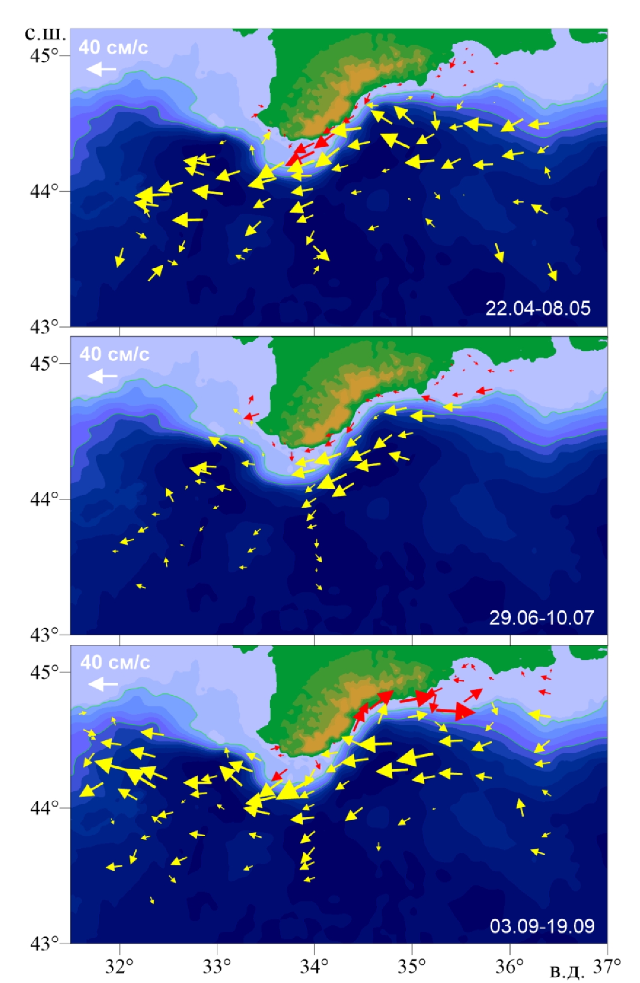 В весенней экспедиции в восточной части полигона горизонтальное распределение скорости течения выявляет антициклонический мезомасштабный вихрь (Крымский антициклон) с характерным масштабом ~ 40 км. В осенней экспедиции на фоне интенсивного потока ОЧТ (30–40 см/с) в прибрежно-шельфовой зоне Южного берега Крыма наблюдается направленное в противоположную сторону мощное вдольбереговое течение (до 40 см/с), сохраняющее свое направление во всей толще вод.